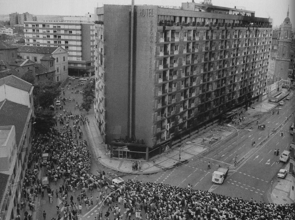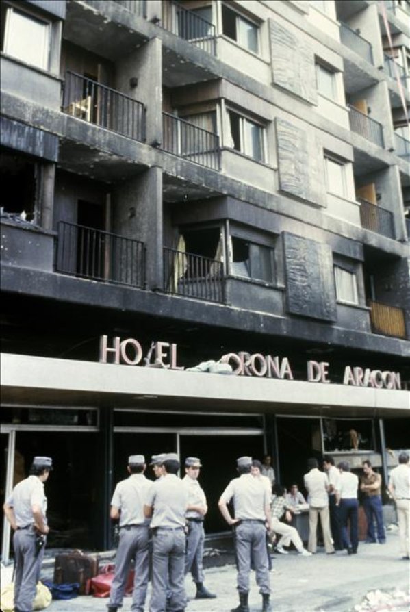 Aquel mismo verano, el 12 de julio se incendiaba el hotel Corona de Aragón de Zaragoza, nosotros nos enteramos al día siguiente, en un tablón de anuncios colocaron las páginas de Heraldo de Aragón, donde salía la noticia, la noticia enseguida corrió de oreja en oreja, y todos nos agolpamos para leer que es lo que había pasado, ese día y los siguientes nos enteramos que habían fallecido más de 70 personas y más de 100 resultaron heridas, recuerdo las fotos en las que se veía saltar a la gente por las ventanas que me hicieron sentir miedo, miedo de no saber si les había pasado algo a mis padres, con 11 años apenas sabía ni donde estaba el hotel, pero me imaginaba a mis padres paseando por debajo en el momento del incendio. Nos dejaron hablar por teléfono con nuestras casas y al oír a nuestras familias encontramos el alivio necesario.