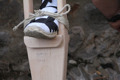 Sobre el atrio de la iglesia unos zancos impolutos y nuevos esperan a su danzante, concentrados y solos, llenos de madera recién lijada, al sol de un día de septiembre. Hechos con madera de haya de los árboles cercanos al pueblo, se labran a la altura correcta de 45 centímetros, que tras los días de danza acabarán con seis u ocho centímetros menos por el desgaste con las piedras.