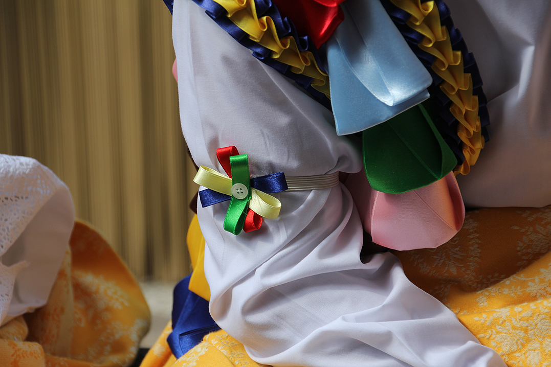 Sobre las mangas de la camisa blanca una roseta de colores ajustada con un botón, ajusta la camisa al brazo.